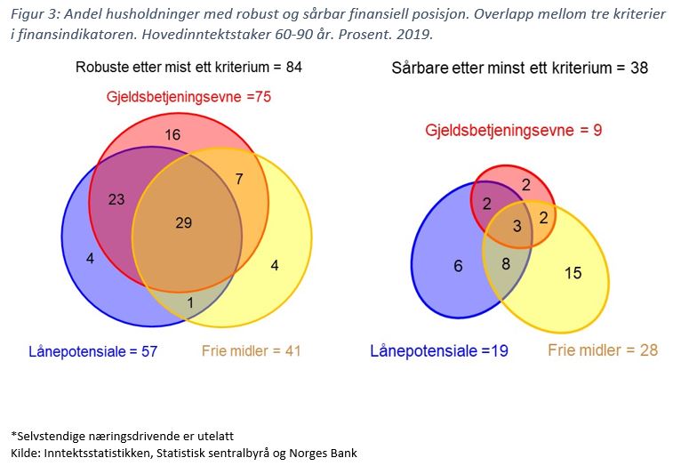 De siste årene har antallet som oppfyller robusthetskriteriet for midler som kan disponeres fritt og mulighet til å øke lån med pant steget litt, mens antallet med god gjeldsbetjeningsevne har avtatt noe. Det reflekterer at både gjeldsnivået og boligformuen har økt. Antallet som oppfyller sårbarhetskriteriet for tilgjengelige disponible midler har vært stabilt, mens antallet med sårbar likviditet og lånepotensiale har doblet seg fra et lavt nivå. Økningen i sårbarhet reflekteres av tall fra Lindorff, som viser at personer over 60 år historisk har hatt mindre mislighold enn andre grupper, men nå utgjør en stigende andel av inkassosakene.
