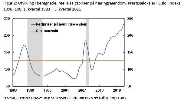 Næringseiendomsforetakene har forbedret sin finansielle stilling de siste årene. Egenkapitalandelen har vokst markert siden 2002, se figur 1. Noe av dette skyldes økt bruk av bokføring til virkelig verdi og god verdistigning på næringseiendom, se figur 2, men de økte verdiene har ikke fullt ut blitt motsvart av økt opplåning. Foretakene er derfor mer solide nå enn før. Under pandemien i 2020 så man et markert fall i markedsleieprisene i næringseiendom, men tapene på næringseiendomslån forble lave (se for eksempel tabell 4, side 70, i Finansiell stabilitet 2021).