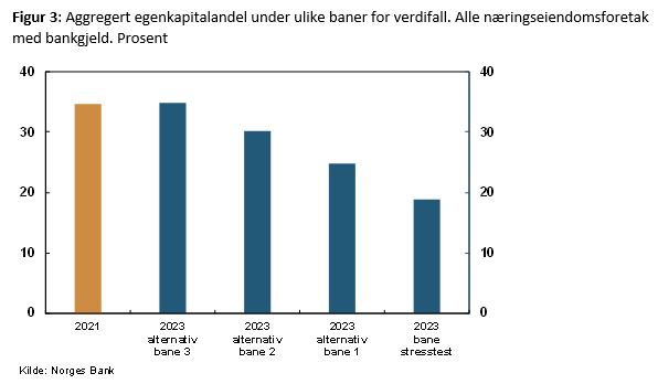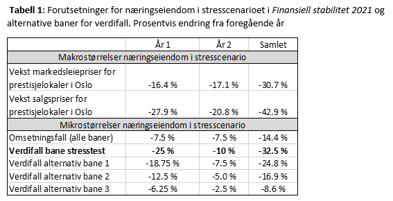 I stresscenarioet fra Finansiell stabilitet 2021 vil et fall i leieprisene og en økning i avkastningskravet redusere salgsprisene på de mest attraktive næringseiendommene med 28 prosent i det første året av stresstesten, og videre med 21 prosent i år 2, se tabell 1.