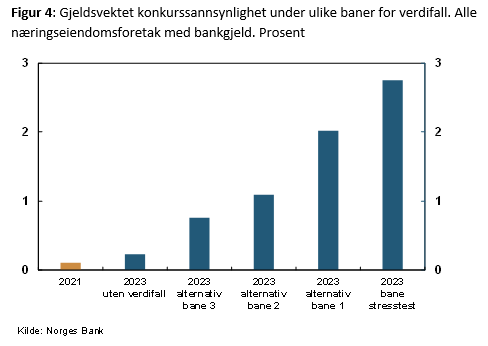 Verdifallet reduserer foretakenes egenkapitalandel og øker konkurssannsynligheten. Med et fall i bokførte eiendomsverdier på 32,5 prosent, vil aggregert egenkapitalandel i næringseiendomsforetakene falle fra om lag 35 prosent til 19 prosent etter 2 år, se figur 3. Det øker estimert gjeldsvektet konkurssannsynlighet fra 0,11 til 2,75 prosent, en faktor på 25, se stresstestbanen i figur 4. Det kan bety at bankene må ta 2,5 - 3 prosent tap på slike lån. I tillegg må bankene trolig legge til grunn større tap ved mislighold (på engelsk kjent som «loss given default», LGD) hvis prisfallet vedvarer, og det vil bidra til å holde tapsraten høy over flere år. For eksempel var tapene på næringseiendomslån i norske forretningsbanker under bankkrisen i 1988-1990 3-4 prosent hvert år (før de eksploderte, med nedskrivninger på rundt 12 prosent i 1991).