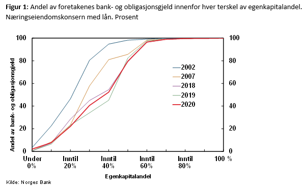 Utlån til næringseiendomsforetak utgjør over 35 prosent av bankenes samlede utlån til foretak. Et næringseiendomsforetak er et foretak som eier, kjøper, selger eller leier ut næringseiendom. Næringseiendom har ofte langsiktige leiekontrakter, og den løpende inntekten er derfor relativt sikker. Dessuten kan foretakene stille pant i fast eiendom. I gode tider er det lite risiko knyttet til slike utlån (se Norges Bank Staff memo 11/2018).