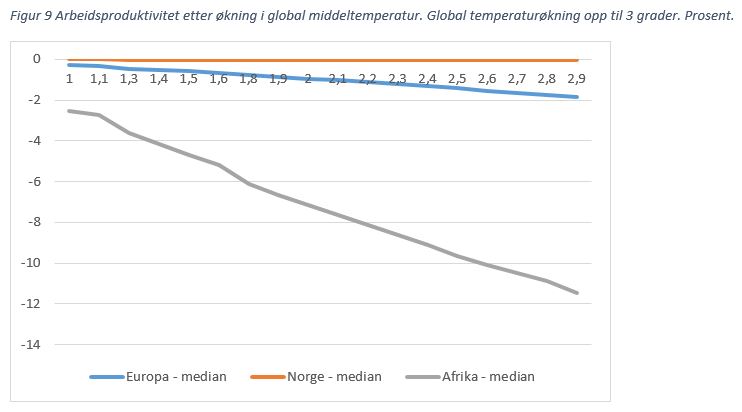 Temperaturøkningen vil ikke gjøre oss i Norge mindre produktive, se figur 9. Arbeidsproduktivitet påvirkes negativ av økt temperatur når temperaturen kommer over et visst nivå. Evne til å motvirke dette gjennom andre tiltak, som aircondition, reduserer kostnaden. Afrika er veldig mye mer utsatt enn Europa – og har også mindre evne til å motvirke de negative effektene. Det anslås at arbeidskraftproduktiviteten i Norge kan falle 0,05 prosent om temperaturen stiger med 3 grader – mot et fall på 11,5 prosent i Afrika.