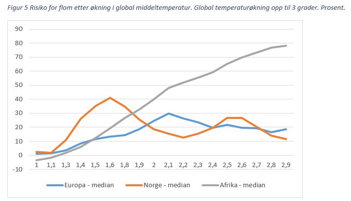 Risikoen for flom avhenger ikke bare av nedbør, men også på form for nedbør og grad av avrenning. Mer regn vil gi bidra til mer flom de nærmeste årene, men mindre snø kan på sikt bidra til at vårflommene blir mindre. I Afrika kan høyere temperatur gi mer avrenning, og der vil risikoen for flom øke betraktelig, se figur 5.