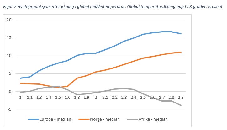 Det er frykt for at mer ustabilt vær kan sette matproduksjonen i fare. Samtidig kan varmere klima gi bedre grøde. Mediananslaget er at produktiviteten i hveteproduksjonen i Norge og Europa skal å gå opp, se figur 7. I Afrika er den på sikt forventet å falle litt. Man ser tilsvarende anslag for effekten på produksjon av mais og ris.