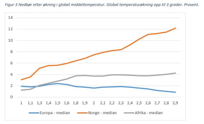 På den annen side kan det ventes mer regn i Norge, se figur 3. Med 3 graders temperaturøkning kan nedbøren øke 3 ganger så mye i Norge som i Afrika. For Europa samlet er nedbøren ventet å holde seg om lag uendret, men her er det store regionale forskjeller: det er ventet mindre nedbør i sydvest, rundt Middelhavet, og mer nedbør i øst og nord. Mer nedbør kan skape utfordringer for bygninger og infrastruktur, men det kan også fremme jordbruk og vannkraft, særlig hvis den er noe jevnt fordelt over året og ikke fører til uhåndterlige flommer.
