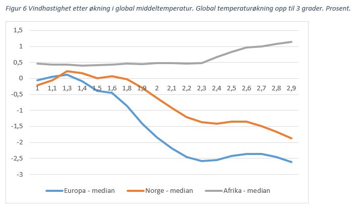Klimaendringene gir ikke bare mer dårlig vær. Temperaturøkningene vil kunne gi mindre vind i både Norge og Europa, se figur 6. Men dette kan på sikt bli en utfordring for alternative energikilder, som vindkraft.