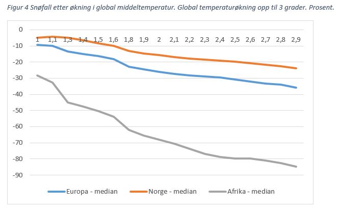 Nedbøren vil også endre form. Det vil snø mindre, se figur 4. I Norge vil mindre snøfall særlig merkes når temperaturen har steget mer enn 2 grader. I Afrika kan 3 graders temperaturøkning føre til at selv de høyeste fjellene er snøfrie året rundt.