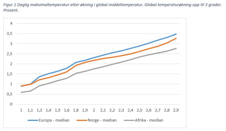 Når den globale gjennomsnittstemperaturen stiger med tre grader, vil forventet maksimaltemperatur vokse om lag like mye. Men det er forskjell mellom regioner, se figur 1. Maksimaltemperaturen er ventet å stige noe mer i Norge og Europa enn i Afrika – som allerede har høyere temperatur.