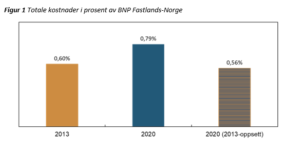 De samfunnsøkonomiske kostnadene for betalingssystemet i Norge er estimert til 24 milliarder kroner i 2020. Det utgjorde 0,79 prosent av BNP for Fastlands-Norge, se figur 1. I 2013 var andelen 0,60 prosent. Oppgangen i kostnadene skyldes at vi har utvidet beregningsgrunnlaget for undersøkelsen. Om vi hadde brukt det samme oppsettet for undersøkelsen som i 2013, ville kostnadene i 2020 utgjort 0,56 prosent av BNP for Fastlands-Norge, altså noe lavere enn i 2013.