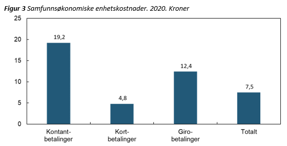 Betalingsinfrastrukturen har en stor andel faste kostnader og er dermed preget av stordriftsfordeler. Kostnaden per betaling (enhetskostnaden) faller med økt antall betalinger. Omvendt vil enhetskostnaden kunne bli høy dersom det er få betalinger av en type. Figur 3 viser at enhetskostnaden er høyest for kontanter, som er det instrumentet som brukes minst, mens kortbetalinger har den klart laveste enhetskostnaden.
