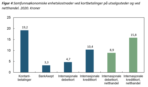 Enhetskostnadene ved netthandel (de grønne søylene) ligger en god del over tilsvarende kostnader med samme instrument for handel ved fysiske utsalgssteder. Dette har flere årsaker. Tiden som husholdningene bruker for å gjennomføre en betaling, er mer enn dobbelt så lang ved netthandel som ved handel på fysisk utsalgssted. Foretakenes ressursinnsats er høyere ved å ta imot nettbetalinger enn betalinger på fysisk utsalgssted. Godtgjørelser som betales fra banker og foretak til underleverandører, som for eksempel de ulike kortselskapene, er også høyere ved nettbetalinger. Gjennomsnittlig salgsbeløp ved netthandel er vesentlig høyere enn gjennomsnittlig salgsbeløp på fysisk utsalgssted, og godtgjørelsene ved internasjonale kort er knyttet til omsatt beløp.