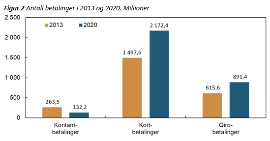 Det har skjedd betydelige endringer i måten vi betaler på siden 2013. Antallet kontantbetalinger har falt mye, mens antallet kort- og girobetalinger (betalinger som går direkte mellom kontoer) har økt med nesten 50 prosent, se figur 2. Kortbetalingene utgjør nå to tredeler av alle betalinger. I visse betalingssituasjoner, som betalinger på utsalgssteder og betalinger ved netthandel, blir nesten alle betalinger nå gjort med kort. Kostnadene for kortbetalinger har derfor stor betydning for de samlede kostnadene i betalingssystemet.