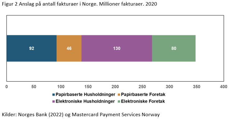 Det føres ikke statistikk over omfanget av fakturaer som utstedes (især gjelder det papirbaserte fakturaer), så dette må anslås. De siste årene er det publisert to studier, Oslo Economics (2020) og Visma (2019), som anslår bruken av elektronisk og papirbasert faktura og besparelser for samfunnet ved overgang til helelektronisk fakturautstedelse.