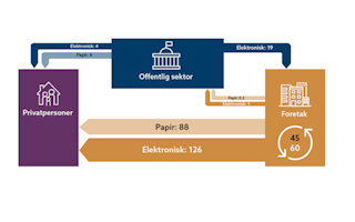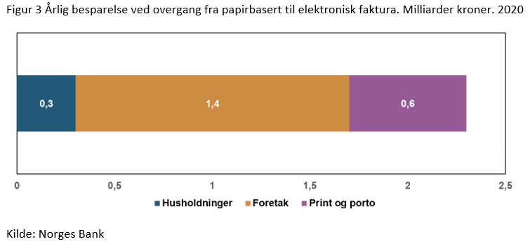 Av dette er 0,3 milliarder kroner redusert tidsbruk for husholdninger og 1,4 milliarder kroner er redusert tidsbruk for foretak. Vi anslår også en samlet besparelse ved utskrift og porto på 0,6 milliarder kroner (om lag 8 kroner per faktura på fysisk papir).