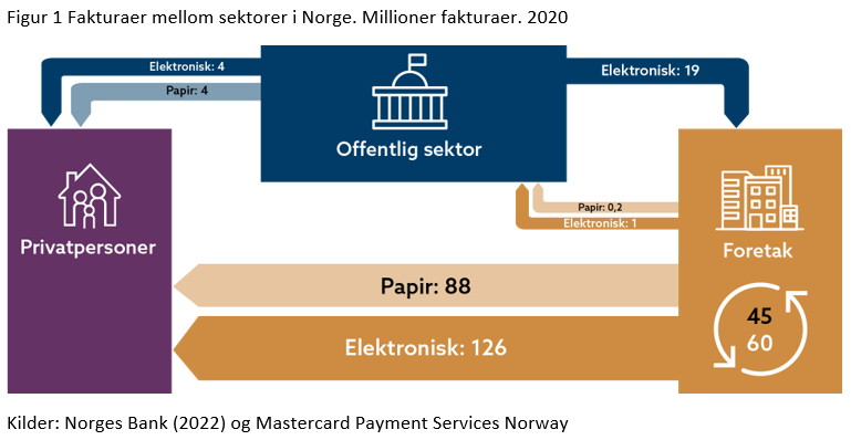 Til en ny analyse av kostnader i betalingssystemet, se Norges Bank (2022), innhentet Norges Bank data om statlige virksomheters, kommuners og foretaks mottatte og utstedte fakturaer. Basert på de innhentede dataene, kom vi til at det i 2020 ble utstedt 348 millioner fakturaer, hvorav 138 millioner var papirbaserte og 210 millioner var elektroniske. Figur 1 viser mellom hvilke sektorer vi estimerer at fakturaene ble sendt (betalingsstrømmene går følgelig motsatt vei).