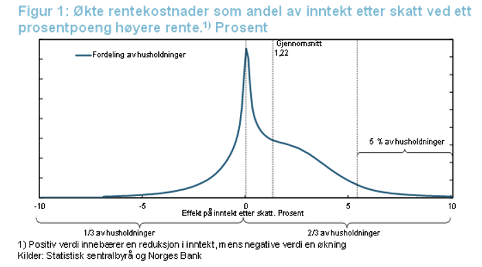 Figur 1 viser effekten av ett prosentpoeng høyere rente på disponibel inntekt for hele fordelingen av husholdninger. Gjennomsnittseffekten etter skatt er 1,2 prosent, mens for medianhusholdningen er renteeffekten noe lavere. Fordelingen er på sitt høyeste rundt null. Disse husholdningene har omtrent like mye gjeld som bankinnskudd og deres løpende inntekter påvirkes lite av endringer i renten. De fleste husholdningene får likevel lavere disponibel inntekt når renten settes opp. Samtidig har nær en tredjedel av norske husholdninger mer bankinnskudd enn gjeld. De vil, alt annet like, få høyere disponibel inntekt ved en økning av styringsrenten.