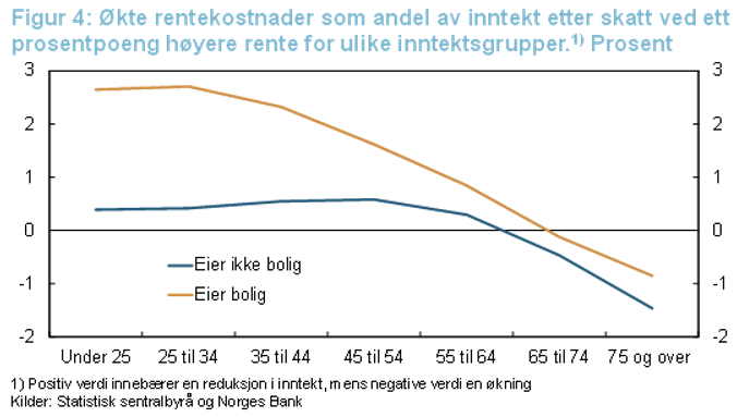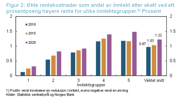 Tallene viser også ulik gjeldsutvikling over tid for de to gruppene. Husholdninger som ikke eier bolig har redusert sin gjeld som andel av inntekt etter skatt i perioden 2010 til 2020, mens de som eier bolig har økt sin gjeld som andel av inntekt. Blant boligeierne er det husholdningene med lavest inntekt som har hatt størst økning i gjeldsbelastningen over den samme perioden. Til tross for dette ville en renteøkning på en prosentenhet i 2020 redusert inntekten til boligeiere i den høyeste inntektsgruppen mer enn dobbelt så mye som boligeiere i den laveste inntektsgruppen.