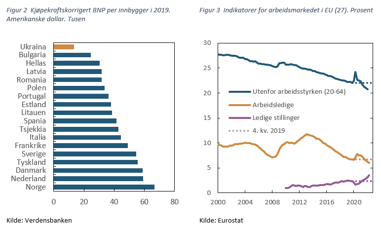De norske tallene gir visse holdepunkter for at konjunktursituasjonen har en del å si. Det ser blant annet ut til at flyktningene som kom til Norge i årene før finanskrisen i 2008 – da den økonomiske veksten her hjemme var svært sterk – har kommet raskere i jobb enn i andre perioder. Dette underbygger at de stramme arbeidsmarkedene i Europa kan styrke ukrainernes jobbmuligheter. Det trekker i samme retning at ukrainerne i første rekke har søkt beskyttelse i land som ligger relativt nær hjemlandet. Kulturforskjellene vil gjennomgående være mindre enn for andre flyktninger som har kommet til Europa.