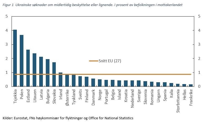 Mot slutten av september i år hadde ifølge FNs høykommisær for flyktninger så mye som 4,1 millioner ukrainere søkt om beskyttelse i europeiske land. Polen er det største mottakerlandet – om lag en tredjedel av ukrainerne har søkt tilflukt der - men målt som andel av befolkningen har tilstrømningen til Tsjekkia vært enda større, se figur 1. Også de baltiske landene har mottatt relativt mange ukrainere. Til sammenligning ligger flyktningetallet i Norge klart under gjennomsnittet for EU, se figur 1.