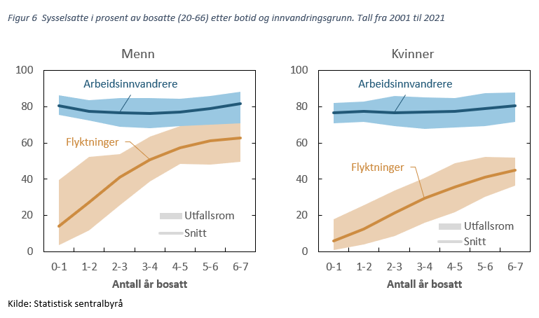 Dette må ses i lys av at det store flertallet av flyktningene som har kommet til Norge de siste par tiårene, i den perioden statistikken dekker, har vært fra asiatiske og afrikanske land. De fleste har gått gjennom lengre introduksjonsprogram og kanskje også tatt utdanning før de har begynt å søke arbeid. Til sammenligning har de bosniske innvandrerne i Norge, som i hovedsak kom til Norge tidlig på 1990-tallet under borgerkrigen i hjemlandet, gjennomgående hatt høy sysselsetting.