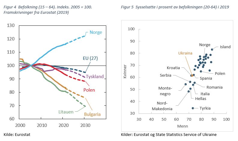 Men selv om ukrainerne trolig har bedre forutsetninger for å komme i jobb enn andre flyktninger, er den samlede usikkerheten såpass stor at jeg ikke vil gi noen prognose på hvor mange som vil bli sysselsatt her. Noen enkle regneeksempler med utgangspunkt i de faktiske tallene kan likevel være informative. Hvis vi går ut fra at halvparten av de flyktningene som til nå har søkt beskyttelse er voksne, og at 60 prosent av disse etter hvert kommer i jobb, vil det isolert sett øke sysselsettingen i EU samlet med 0,5 prosent. Det vil være et vesentlig bidrag, men ikke nok til å veie opp for et ventet fall i befolkningen i arbeidsfør alder på mer enn 3 prosent i løpet av dette tiåret. Fordi flyktningene er ujevnt fordelt mellom land, blir imidlertid de mulige utslagene i sysselsettingen også svært forskjellige. Med tilsvarende antakelser som over blir økningen i sysselsettingen i Polen og Tsjekkia på godt over 2 prosent, på 0,5 prosent i Tyskland, på 0,2 prosent i Norge og på 0,1 prosent i Frankrike.