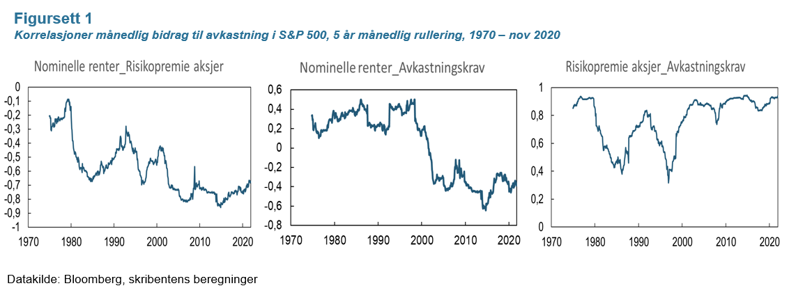 Sammenhengen mellom nominelle renter og det samlede avkastningskravet var positiv frem til år 2000, men er negativ etter det. Det vil si at etter år 2000 har perioder med økt avkastningskrav typisk blitt dempet av fall i rentene. Det tilsier at et økt (redusert) avkastningskrav som regel kommer fra et høyere (lavere) krav til risikokompensasjon, i og med at korrelasjonen mellom renter og aksjespesifikk risikopremie er negativ. Sammenhengen mellom risikopremien og nominelle renter er derfor viktig for avkastningskravets samlede påvirkning på markedsprisen. Risikopremien har sterk positiv samvariasjon med avkastningskravet i hele perioden som vist i figuren helt til høyre. Bidrag fra det totale avkastningskravet har naturlig nok sterk positiv korrelasjon med avkastningen i S&P gjennom hele perioden (mellom 0,83 til 0,99).