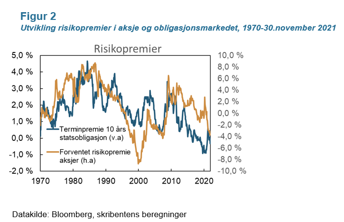 Jeg ønsker nå å se nærmere på sammenhengen mellom risikopremien i renter og den aksjespesifikke risikopremien. I figur 2 viser jeg utviklingen i terminpremien for amerikanske statsobligasjoner med 10 års løpetid og aksjemodellens forventede risikopremie på 10 års horisont. Terminpremien jeg bruker er slik Adrian, Crump & Moench i Federal Reserve Bank of New York kalkulerer den. Den representerer den ekstra avkastningen investorene kan forvente gjennom å holde obligasjoner med 10-års løpetid istedenfor å rullere i kortsiktige løpetider. En kan tenke at terminpremien inneholder en kompensasjon for usikkerhet omkring fremtidig inflasjon, fremtidig tilbud av statsobligasjoner (hvor økt tilbud kan tenkes å føre til et større krav) og en kompensasjon for at lengre statsobligasjoner har større følsomhet til endringer i renten. En høyere terminpremie, alt annet like, indikerer at investorer er mer risikoaverse og/eller antatt risiko ved lengre obligasjoner er høy. Why are interest rates so low, part 4: Term premiums (brookings.edu)