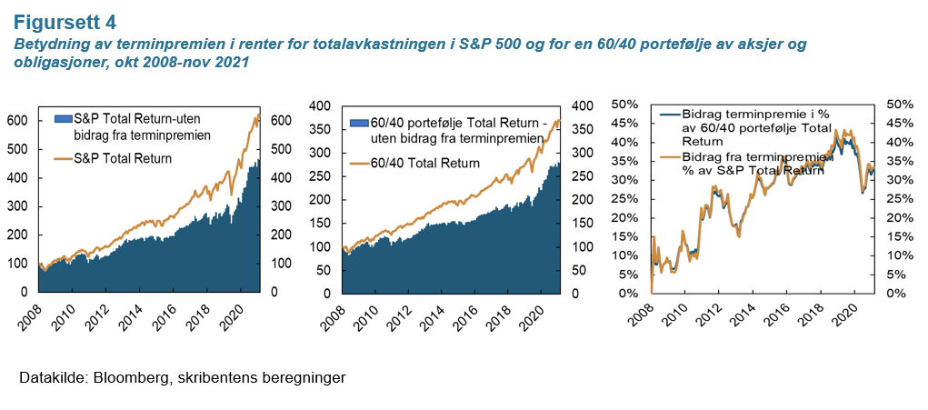 Sentralbankene har gjennom aktivakjøpsprogrammene hatt som målsetning å redusere terminpremien. Jeg ønsker nå å vise hvordan utviklingen i terminpremien har påvirket avkastningen i de vanligste investeringsproduktene. I figursett 4 viser jeg hvordan terminpremien har bidratt til totalavkastningen (altså inklusive dividende) i S&P 500 og for en portefølje bestående av 60 prosent i S&P og 40 prosent obligasjoner siden oktober 2008. Obligasjonsandelen er plassert i Bloombergs US Treasury obligasjonsindeks.