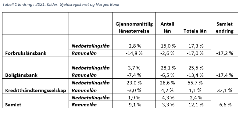 Samlet utestående rentebærende forbruksgjeld i norske husholdninger falt nesten 7 prosent i 2021. Samtidig har det vært en vridning i hvem som står som motpart – utlån fra bankene har falt markert, mens utlån som holdes av selskaper som håndterer dårlige lån har vokst. Særlig risikoutsatte lån utgjorde ved inngangen til 2022 over 52 prosent av utestående forbruksgjeld, en økning på over 4 prosentpoeng fra inngangen til 2021.