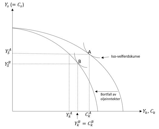 Omstillingen fra den gamle til den nye likevekten er illustrert i figuren. Siden dette er en velkjent figur fra undervisningen i samfunnsøkonomi, skal vi ikke dvele mer ved den enn at økonomien må gå fra punktet A, der landet har betydelige oljeinntekter, til punktet B, der vi for enkelhets skyld har antatt at alle oljeinntektene er borte (og at vi ikke har et oljefond som genererer valutainntekter). For å balansere utenrikshandelen, må konsumet av konkurranseutsatte varer (Ck) i den nye likevekten over tid være lik (inntektene av) produksjonen (Yk).