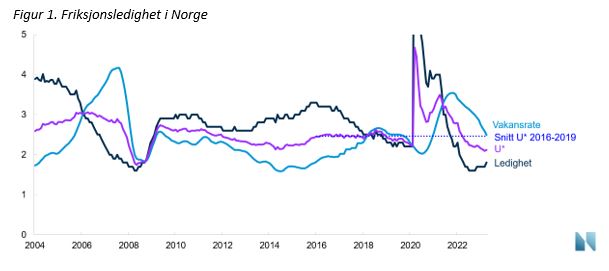 Er ledigheten er høyere enn u *, er det en indikasjon på ledige ressurser i arbeidsmarkedet som bidrar til at kostnadene i arbeidsmarkedet er høyere enn de trenger å være. Forfatterne viser at ledigheten i USA stort sett ligget høyere enn u * fra 1950-tallet og frem til i dag. Også i Norge har ledigheten i lengre perioder ligget høyere enn u *. Etter pandemien har ledigheten falt raskt og ligget lavere enn u *. Ikke siden i forkant av finanskrisen har ligget like mye under u *.