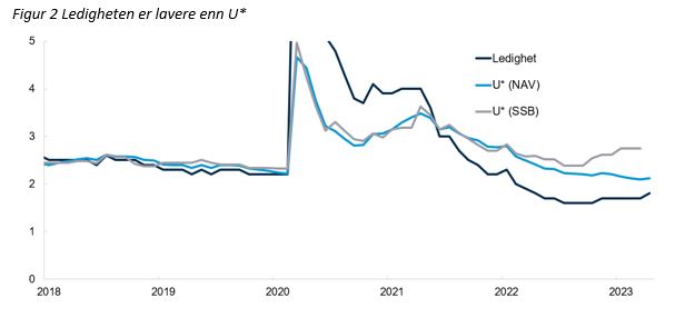 Hvor langt under u * ledigheten nå befinner seg, er imidlertid noe usikkert. NAVs statistikk, som benyttes i beregningene over, viser at trenden i nye ledige stillinger har avtatt siden utgangen av 2021. SSBs utvalgsundersøkelse viser en oppgang i antall ledige stillinger til og med starten av 2023. Legger vi derfor i stedet SSBs undersøkelse til grunn, har u * tatt seg noe opp, se figur 2.