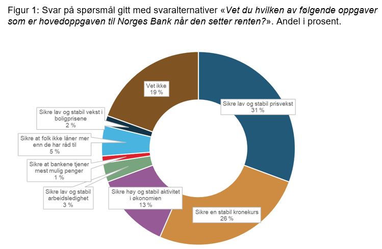 I undersøkelsen fikk respondentene spørsmål om hva som er Norges Banks hovedoppgave. De fikk flere svaralternativer. «Å sikre lav og stabil prisvekst» var det alternativet som fikk høyest svarprosent med rundt 30 prosent, se figur 1. Mange svarte også at hovedoppgaven var «å sikre en stabil kronekurs». Utviklingen i kronekursen har betydning for prisveksten, og dermed også for pengepolitikken. Det kan være grunnen til at mange tror at å sikre stabil kronekurs er hovedoppgaven til Norges Bank, men det kan også ha sammenheng med at Norges Bank hadde valutakursmål i pengepolitikken før inflasjonsmålet ble innført i 2001. En del svarte også «å sikre høy og stabil aktivitet i økonomien», noe som også er en viktig målsetning for Norges Bank. Det var svært få som svarte at hovedoppgaven er å sikre at bankene tjener mest mulig penger, noe som ikke ligger innenfor Norges Banks ansvar.