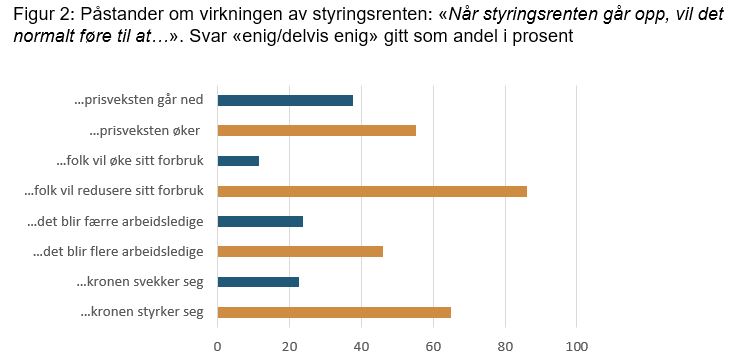 Norges Bank er opptatt av at folk skal forstå hvorfor renten settes opp eller ned, og i undersøkelsen ønsket banken å måle i hvilken grad folk vet hvordan renten virker inn i økonomien. Respondentene ble bedt om å ta stilling til ulike påstander om effekter av økte renter, se figur 2.