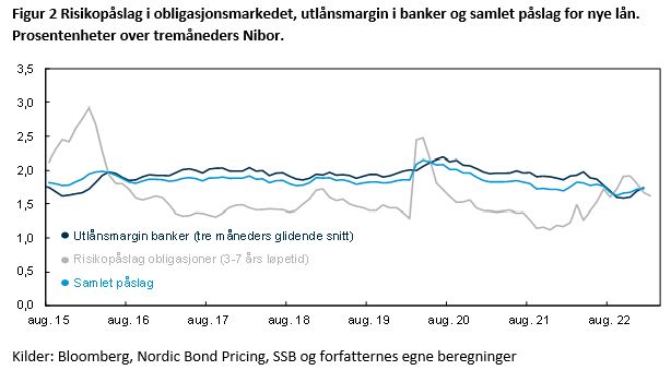 Et åpenbart spørsmål er hvorfor utlånsmarginen til bankene har vært så stabil i senere år. I perioder med økt usikkerhet øker risikoen for at foretakene misligholder sin gjeld og bankene må typisk betale mer for å ta opp ny obligasjonsfinansiering, noe som begge deler skulle trekke i retning av en høyere utlånsmargin på nye lån. Grimme (2022) peker på bankenes ønske om å beholde langsiktige kundeforhold som en mulig årsak til at de ikke nødvendigvis justerer så mye på utlånsmarginen ved økt usikkerhet. Store økninger i obligasjonspåslagene har i senere år ofte vært relativt kortvarige. Om bankene forventer at påslagene vil komme ned igjen, velter de kanskje ikke hele den økte marginalkostnaden over på kundene. I tillegg til obligasjonsgjeld er beholdningen av utlån i stor grad finansiert med innskudd. I løpet av renteoppgangen i 2022 har bankene økt innskuddsrenten mindre enn utlånsrenten, noe som har bidratt til å trekke den samlede lønnsomheten i bankene opp. Økt lønnsomhet gir fleksibilitet til å konkurrere mer på utlånsmarginen og kan være en del av forklaringen på hvorfor marginene ikke har økt det siste året.