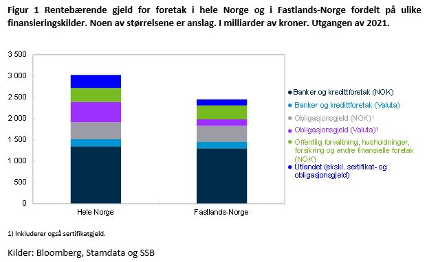Banklån er foretakenes viktigste kilde til gjeldsfinansiering. Utestående lån fra banker er på rundt 1 500 milliarder, der det aller meste er i norske kroner til foretak i Fastlands-Norge, se figur 1. I tillegg har foretakene samlet sett en del obligasjonsgjeld. Utestående obligasjonsgjeld er på 900 milliarder, men bare rundt 500 milliarder er til foretak i Fastlands-Norge. Forskjellen skyldes at noen store foretak innen olje- og sjøfart låner betydelig beløp i obligasjonsmarkedet i utenlandsk valuta. Det meste av obligasjonsgjelden til fastlandsforetakene er i norske kroner.