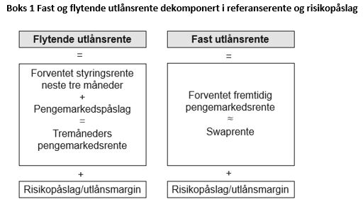 Utlånsrenten til foretak avhenger av styringsrenten, forventninger om denne fremover, og ulike risikopåslag, se boks 1. Den mest brukte referanserenten i foretakenes bank- og obligasjonsgjeld med flytende rente er pengemarkedsrenten tremåneders Nibor. Nibor uttrykker markedets forventning til styringsrenten de neste tre månedene, og et risikopåslag, ofte omtalt som pengemarkedspåslaget. I tillegg betaler foretakene et påslag utover Nibor i form av en utlånsmargin på bankfinansiering og et risikopåslag i obligasjonsmarkedet. Bankenes utlånsmargin og risikopåslaget i obligasjonsmarkedet skal i grove trekk dekke bankene og investorenes forventede tap, andre kostnader og krav til egenkapitalavkastning. For foretak som ønsker fastrente, vil i tillegg utviklingen i renter med lang løpetid være viktig. Fastrenter tar typisk utgangspunkt i lange swaprenter, som i hovedsak avhenger av forventinger om fremtidige pengemarkedsrenter. Videre i bloggen fokuserer vi på nye lån med flytende rente.