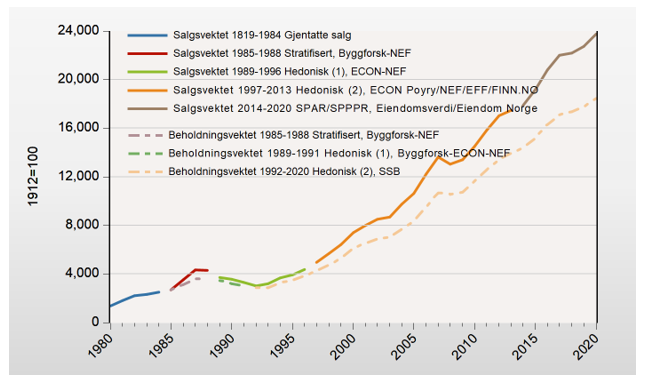 Figur 2 viser boligprisutviklingen siden 1980. De ulike fargene representerer boligprisindekser som er basert på ulike metoder. Heltrukne/stiplede linjer representerer henholdsvis salgsvektede/beholdningsvektede indekser. Alle indeksene har vært nødvendige for å lage lange sammenhengende tidsserier med boligprisindekser. Figuren viser at det betyr mye om man bruker en indeks basert på salgsvekter eller om man bruker en indeks basert på beholdningsvekter.