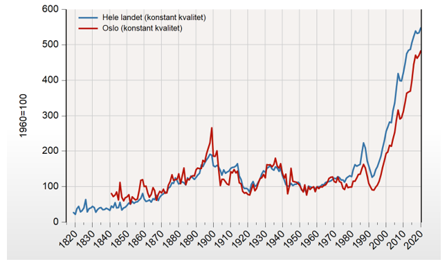 Figur 1 viser realboligprisutviklingen i Norge gjennom mer enn 200 år. Den blå linjen starter i 1819 og viser indeksen for landet som helhet. Den røde linjen starter i 1840 og viser utviklingen i Oslo. Begge indeksene tar hensyn til heterogenitet i boligmassen ved at de bare inkluderer et utvalg av boliger som har blitt omsatt flere ganger («gjentatte salg»-metoden). Boligprisene i Oslo varierer mer enn for landsgjennomsnittet, særlig i perioden rundt "Kristianiakrakket" i 1899, en hendelse vi fortsatt finner spor av mange steder i byen den dag i dag, som for eksempel på Grünerløkka og Frogner. Det tok mer enn hundre år før fallet i realprisen på boliger i Oslo i 1899 var hentet inn.