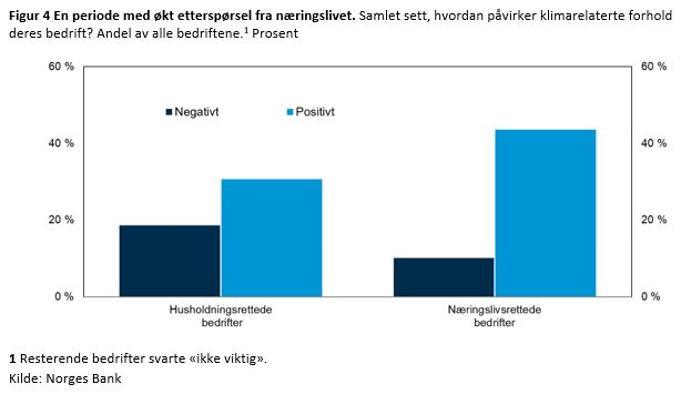Det er særlig næringsrettede bedrifter som ser muligheter i det grønne skiftet, se figur 4. I intervjuene trekker flere frem at strengere rapporteringsplikter, økt behov for ny kompetanse og etterspørsel etter utslippsreduserende, energieffektiv teknologi øker etterspørselen etter deres varer og tjenester. Det er flere husholdningsrettede enn næringslivsrettede bedrifter som oppgir at klimaforhold i sum er negativt for virksomheten. Svarene må trolig ses i sammenheng med at bedriftene ellers i undesøkelsen er bedt om å vurdere konsekvenser av faktorer knyttet til klima i et relativt kortsiktig perspektiv. Det betyr ikke nødvendigvis at klimaendringer og omstillingen til et lavutslippssamfunn frem mot 2050 i sum vil bidra til vekst i norsk økonomi, men kan bety at omstillingen som nå skjer i mange bedrifter, i en periode kan gi markedsmuligheter for flere.