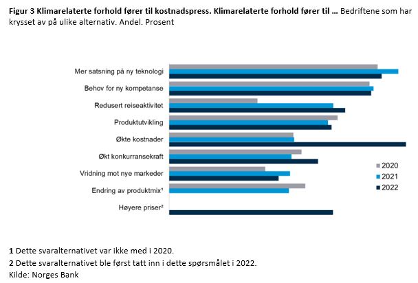 Klimarelaterte endringer påvirker bedriftene på mange måter. Et flertall, nesten 60 prosent, ser sammenheng mellom klima og kostnadsvekst, se figur 3. Det er en dobling sammenlignet med de foregående undersøkelsene. Oppgangen skyldes trolig en periode med sterk kostnadsvekst, relatert til Russlands invasjon av Ukraina og ettervirkninger av koronapandemien, men også klimaomstilling, økte karbonpriser og flere forekomster av ekstremvær. Perioden kan ha gitt økt oppmerksomhet rundt kostnadseffektene av mer ustabilt vær, økt etterspørsel etter fornybar energi og høyere karbonpriser.