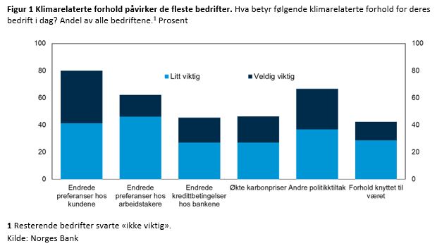 9 av 10 norske bedrifter oppgir at forhold relatert til klimaendringer og omstilling til et lavutslippssamfunn er viktig for deres virksomhet. Det er særlig klimaomstillingen som påvirker bedriftene, og da spesielt klimapolitikk og endringer i kunders preferanser. Betydelig flere enn tidligere merker at klimaomstilling og økte forekomster av ekstremvær kommer med høyere kostnader.