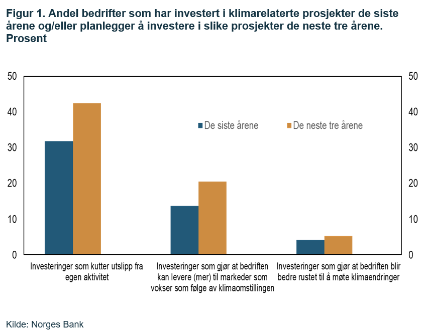 Norsk økonomi er i økende grad påvirket av klimarelaterte forhold. Jeg ser på hvordan investeringene påvirkes, basert på en undersøkelse blant bedrifter i Regionalt nettverk. De sier at klimaomstillingen gir økte investeringer samlet sett. Over 40 prosent av dem har investert i klimarelaterte prosjekter de siste årene – og mer enn 50 prosent vil gjøre det i 2023 til 2025. Mange sier imidlertid at disse investeringene begrenses eller vil kunne bli begrenset av økte/høye kostnader, utilstrekkelig politikk og manglende tilgang på rimelig kraft. Slike forhold har ført til at flere klimaprosjekter har blitt utsatt eller stanset den siste tiden.