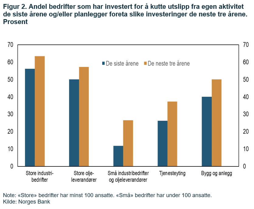 De store industribedriftene – her definert som industribedrifter med minst 100 ansatte – er spesielt tilbøyelige til å investere i prosjekter som kutter utslipp fra egen aktivitet. Godt over 50 prosent av dem har investert i slike prosjekter den siste tiden – og mer enn 60 prosent vil gjøre det de neste årene, se figur 2. Dette gjenspeiler at (i) mange store industribedrifter har høye utslipp og (ii) nesten alle de store industribedriftene i utvalget har planer for å kutte egne utslipp frem mot 2030. Et flertall av de store oljeleverandørene har også planer for å investere i utslippsreduserende tiltak. Omfanget av slike investeringer er langt mindre – men klart økende – blant de små olje- og industribedriftene. Nesten 40 prosent av tjenesteyterne og 50 prosent av bygg- og anleggsbedriftene vil investere i utslippsreduserende prosjekter i 2023 til 2025. Resultatet for tjenesteyting må ses i lys av at tjenesteytere utenom transportsektoren har relativt lave utslipp.
