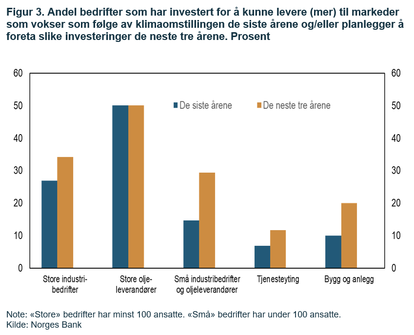 Norske bedrifter er i ferd med å etablere virksomhet som vil tjene på klimaomstillingen, herunder virksomhet innen havvind, hydrogen, batterier, bioøkonomi, karbonhåndtering og grønn skipsfart. Bedrifter med bakgrunn fra oljeindustrien står bak mange av disse satsingene: De kan bruke sin erfaring og kunnskap inn i flere av de nye næringene, og de trenger flere ben å stå på etter hvert som oljevirksomheten går ned. Halvparten av de store oljeleverandørene i utvalget har investert for å kunne levere (mer) til markeder som vokser som følge av klimaomstillingen, se figur 3, og de vil fortsette å gjøre det i 2023 til 2025. En tredel av de øvrige olje- og industribedriftene vil investere i slike prosjekter de nærmeste årene. Bedriftene innen tjenesteyting og bygg og anlegg er mindre tilbøyelige til å foreta slike investeringer.
