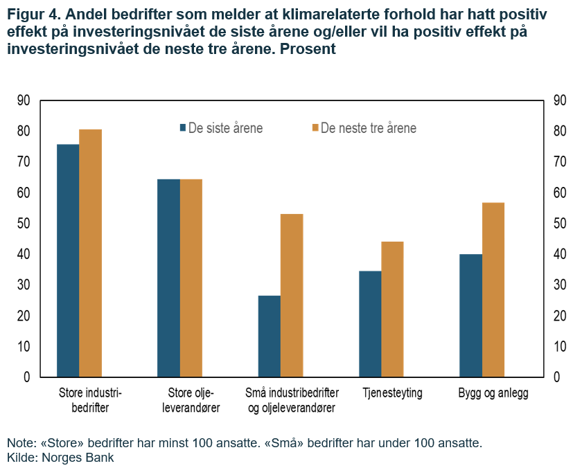 Bedriftene sier imidlertid at klimaomstillingen gir økte investeringer (i egen bedrift) samlet sett. Over 40 prosent av dem sier at klimaomstillingen har ført til høyere samlede investeringer de siste årene, og over 50 prosent sier at klimarelaterte forhold vil ha positiv effekt på de samlede investeringene i 2023 til 2025. Kun 1½ prosent av bedriftene oppgir at investeringene dempes av klimarelaterte forhold i denne perioden.