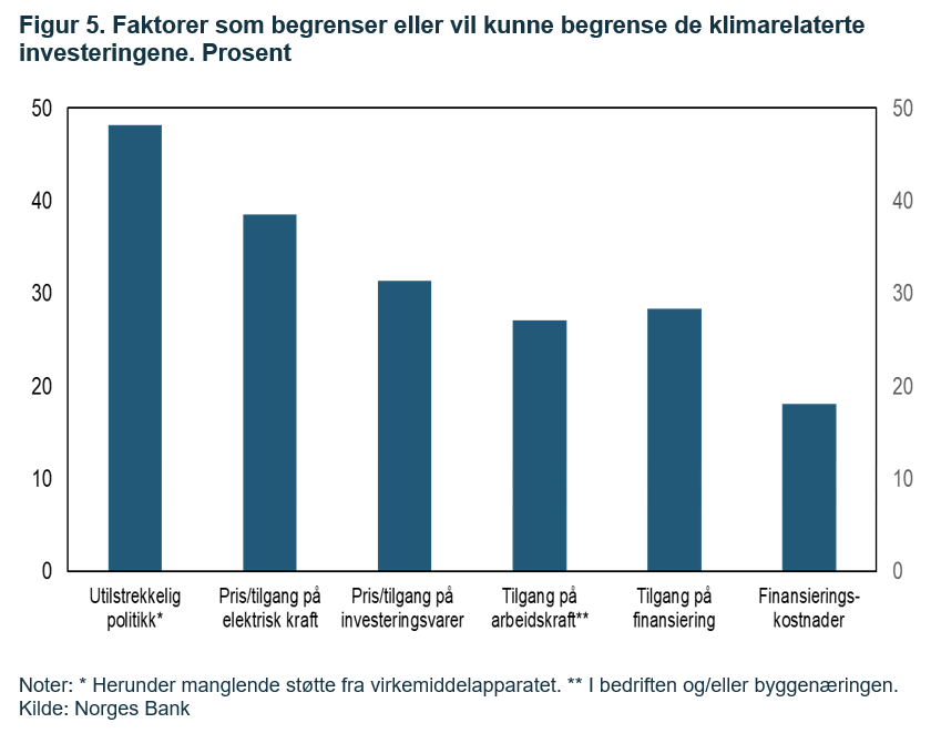 Nesten 30 prosent av bedriftene sier at tilgang på finansiering er eller kan bli en begrensende faktor for klimainvesteringene, mens nesten 20 prosent melder at høye finansieringskostnader kan begrense slike investeringer. Renteøkningen det siste året kan ha ført til at høye finansieringskostnader har blitt en viktigere begrensende faktor for klimainvesteringene.
