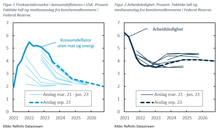 Utviklingen siden den gang har gitt større grunn til optimisme. Årsveksten i kjerneprisene har avtatt. Arbeidsledigheten har økt litt, men holdt seg under 4 prosent. I Feds siste anslag, fra september, avtar kjerneinflasjonen videre og er nede på målet på 2 prosent ved utgangen av 2026. Arbeidsledigheten øker litt videre, men bare til så vidt over 4 prosent, langt unna de nivåene Summers antydet, og også noe mindre enn det Fed anslo i de foregående rundene, se figur 2.