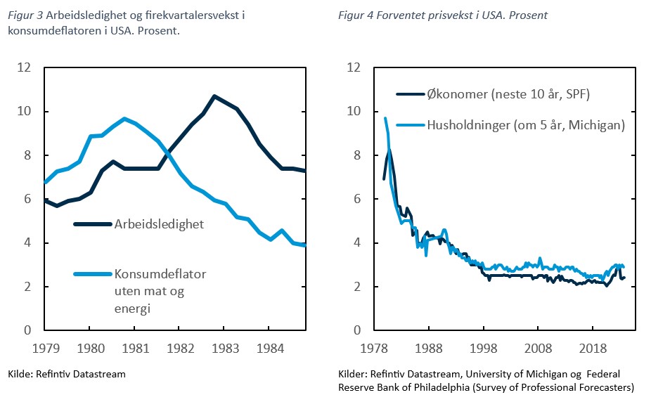 Hvis husholdninger og foretak derimot venner seg til den høye prisveksten, kan veien tilbake til målet bli langt tyngre. Den forrige perioden med høy prisvekst, gjennom 1970-tallet, trekkes ofte fram som et eksempel. Etter at Paul Volcker tiltrådte som amerikansk sentralbanksjef i august 1979, ble pengepolitikken strammet klart til. Det reduserte prisveksten utover på 1980-tallet, men samtidig gikk økonomien gjennom en dyp lavkonjunktur. I 1982 nådde ledigheten nesten 11 prosent, opp fra rundt 6 prosent i 1979, se figur 3. Nedturen skyldtes imidlertid også at oljeprisen mer enn doblet seg etter den iranske revolusjonen i 1979, og prisen holdt seg høy godt inn på 1980-tallet.