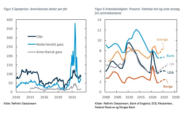 Dette kan bidra til at oppgaven med å få ned prisveksten blir noe enklere i USA enn i europeiske land. Ser vi på de siste anslagene fra noen europeiske sentralbanker, fremstår de imidlertid ikke som spesielt pessimistiske. Noe av grunnen kan være at gassprisene har falt kraftig siden 2022. I de siste anslagene fra den europeiske sentralbanken øker arbeidsledigheten bare med 0,2 prosentenheter fra 2023 til 2025, til 6,7 prosent, en lavere ledighet enn noen gang før pandemien, se figur 6. I Sverige anslås arbeidsledigheten å øke med om lag en prosentenhet i løpet av prognoseperioden, mens ledighetsøkningen i Storbritannia er noe større. Ledigheten på øyriket vil imidlertid fortsatt være godt under et historisk snitt. I Norge anslås den registrerte ledigheten å stige fra 1,8 prosent i 2022 til 2,4 prosent i 2026, men det er fortsatt lavere enn den gjennomsnittlige ledigheten på 2010-tallet. Norges Bank har lagt til grunn at en ledighetsrate på 2 ¼ prosent er forenlig med normal kapasitetsutnytting.